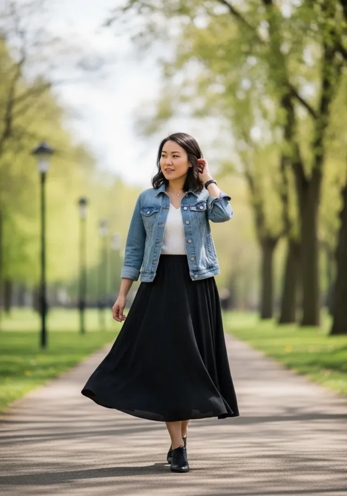 This outfit combines a structured denim jacket with a flowy black maxi skirt and a simple white top. The contrast between casual denim and soft movement in the skirt makes the whole look feel balanced and interesting. Flat shoes keep it practical for everyday wear.