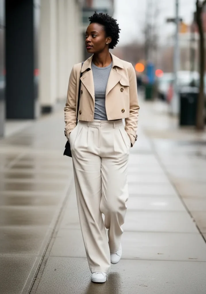 A cropped neutral jacket is layered over a white top and paired with relaxed beige trousers. The soft tones keep the outfit cohesive while white sneakers add a modern casual touch. It feels polished without being overly formal.