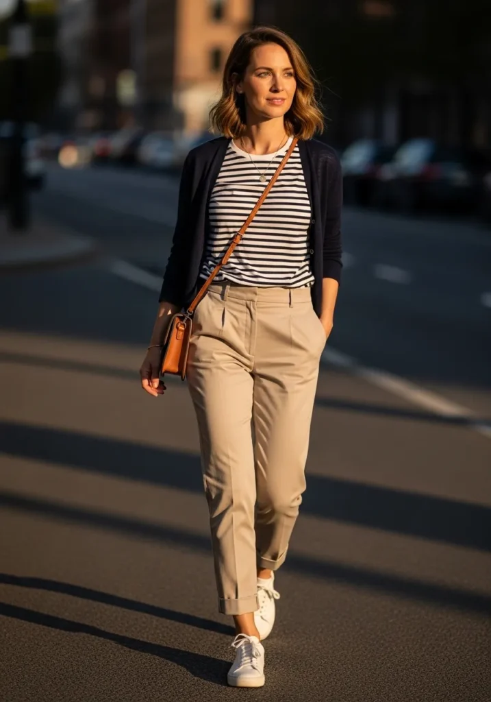 This outfit features a striped top paired with slim neutral pants and white sneakers. A crossbody bag adds a practical touch while keeping the look casual and modern. The stripes bring personality without overpowering the outfit.