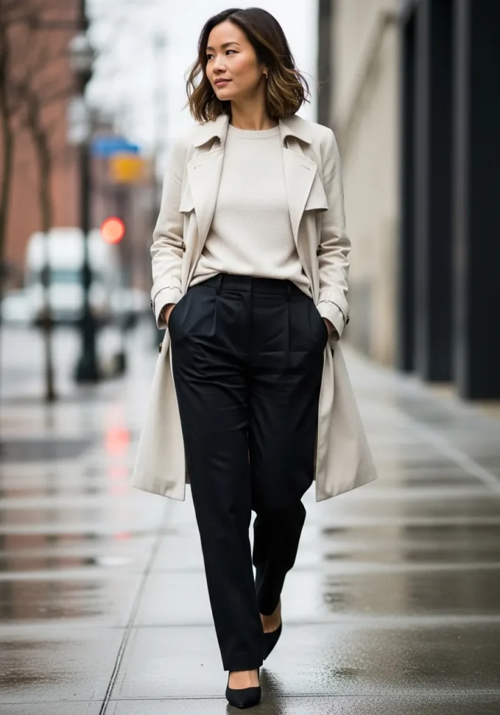 Soft Trench and Tailored Black Pants
