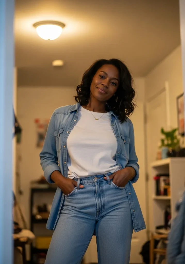 This final outfit shows a white tee layered with a denim shirt and light wash jeans for a relaxed at home feel. The layers feel casual and approachable while still looking styled. The overall vibe is cozy and effortless.