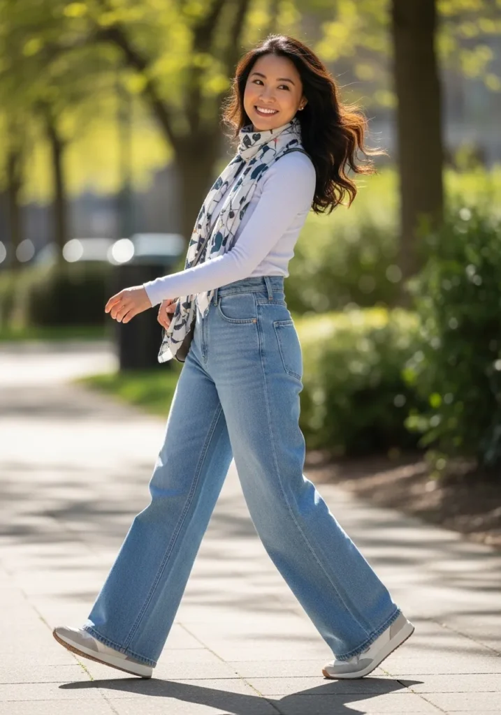 This look pairs a fitted white long sleeve top with high waisted wide leg jeans for a fresh spring silhouette. A lightweight patterned scarf adds movement and personality without overwhelming the outfit. Casual sneakers keep the look grounded and walkable.
