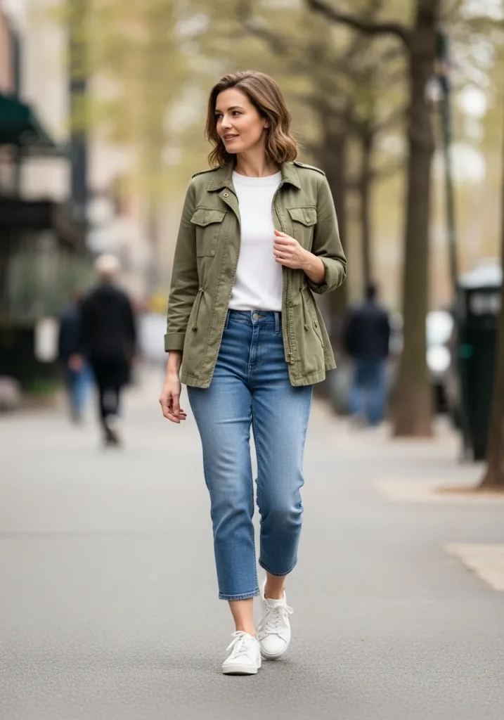 This outfit features a lightweight utility jacket layered over a simple white tee and classic blue jeans. The jacket adds structure and a bit of edge while keeping the outfit casual. White sneakers make it practical and easy to wear all day.