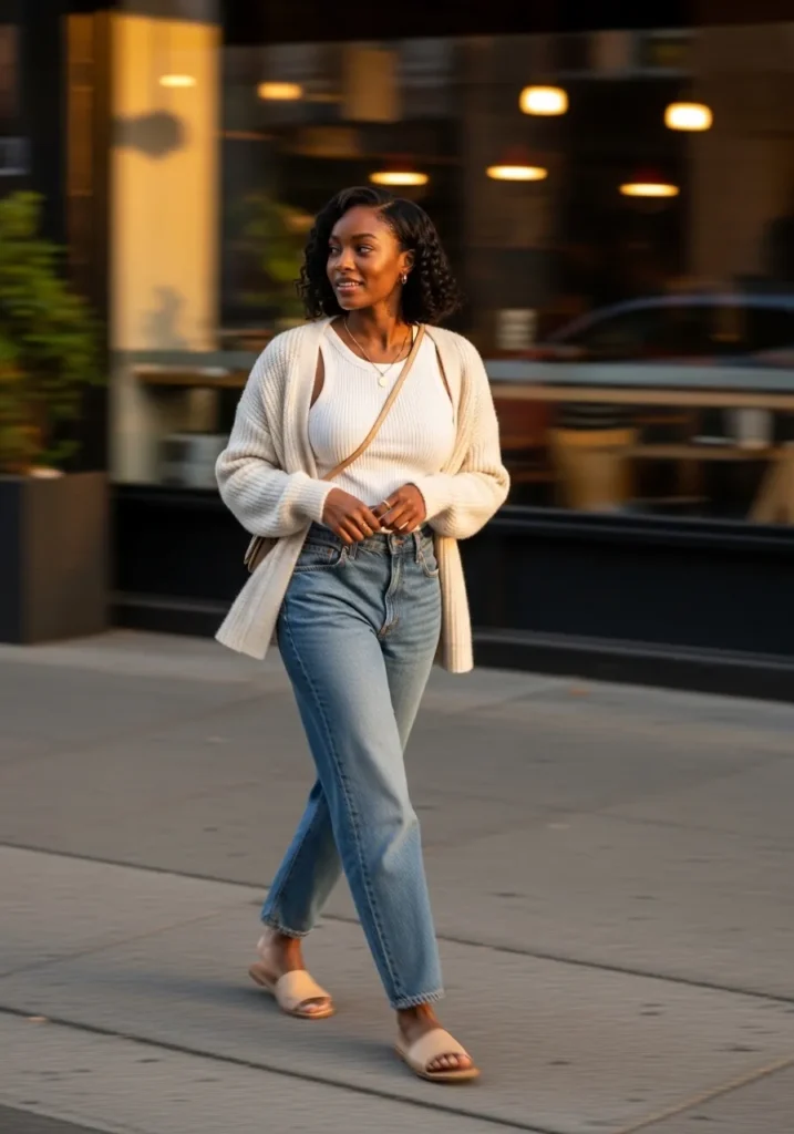 This look combines a ribbed tank top with a cozy open cardigan and relaxed fit jeans. The layers feel soft and casual while still looking styled and thoughtful. Neutral sandals keep the outfit light and spring friendly.