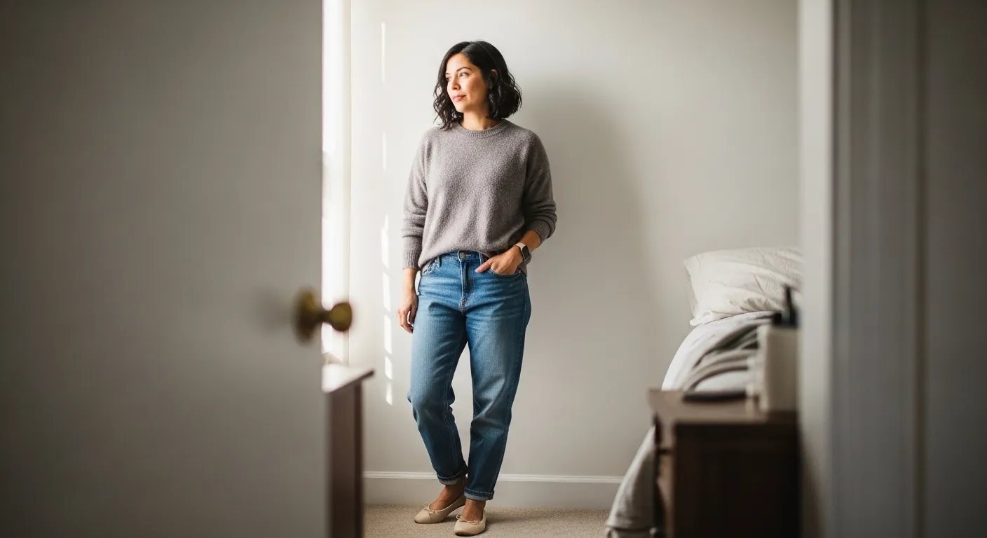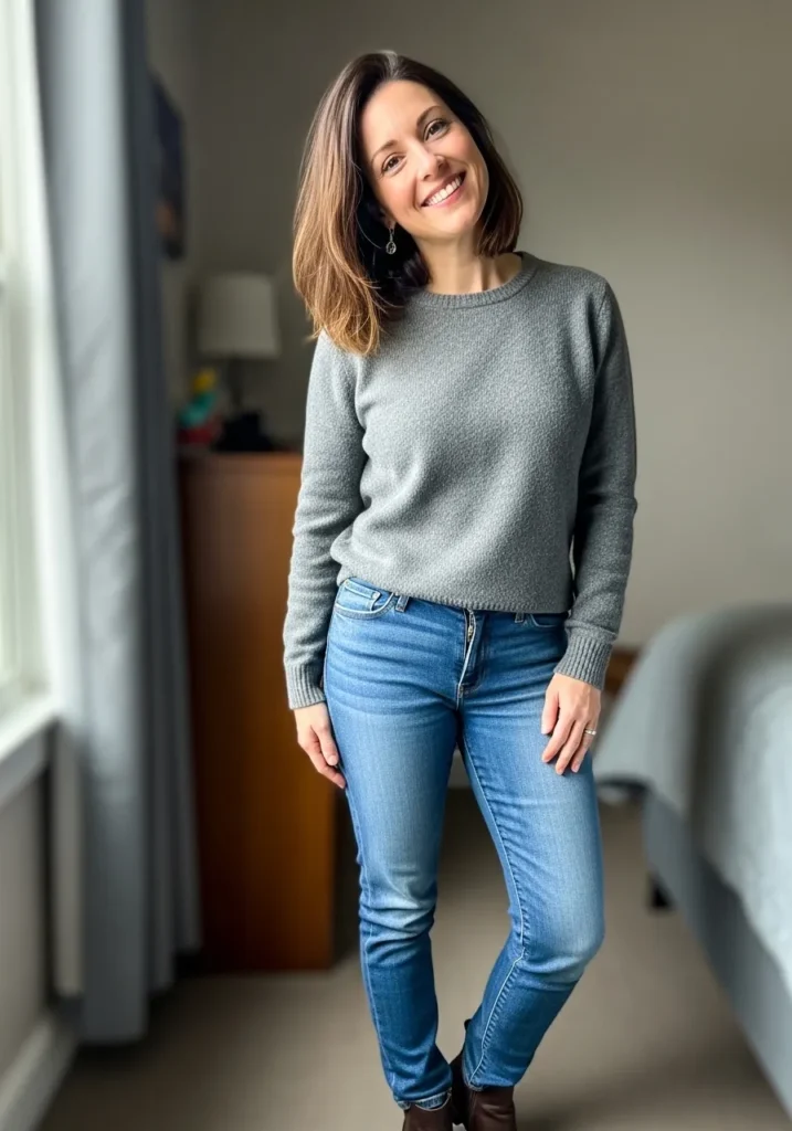 This outfit keeps things minimal with a simple knit top tucked into classic blue jeans. The clean lines and soft fabric give it a relaxed but polished feel. Neutral shoes keep everything timeless and easy.
