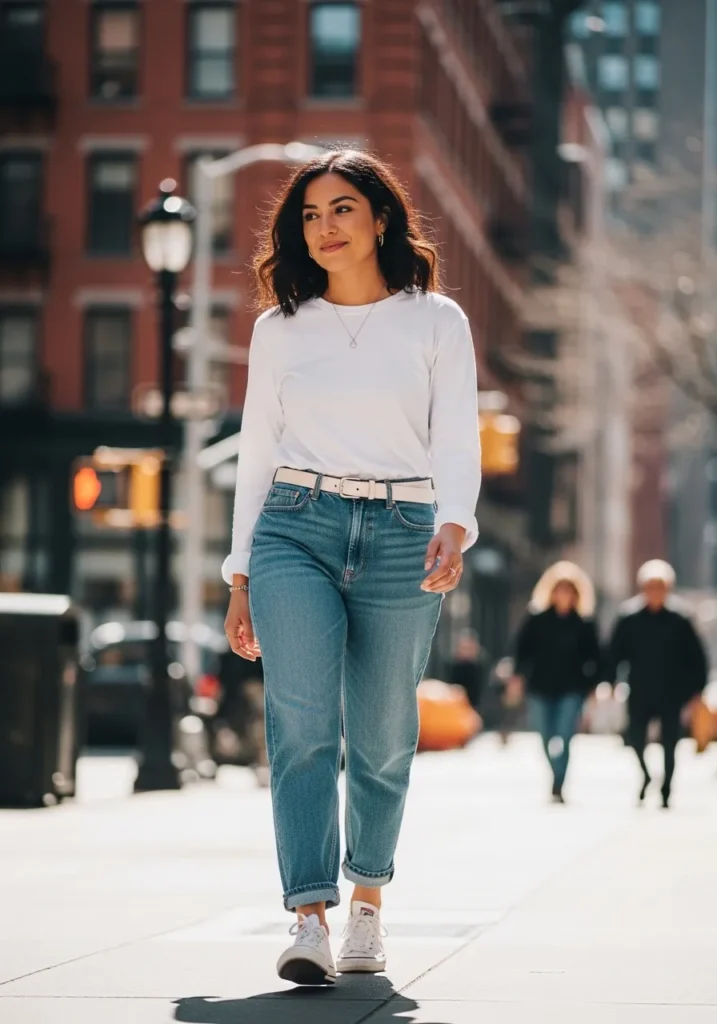 This look keeps things fresh with a white long sleeve top tucked into light wash jeans. The fit feels relaxed and casual while still looking clean. Sneakers complete the outfit with an easy everyday feel.