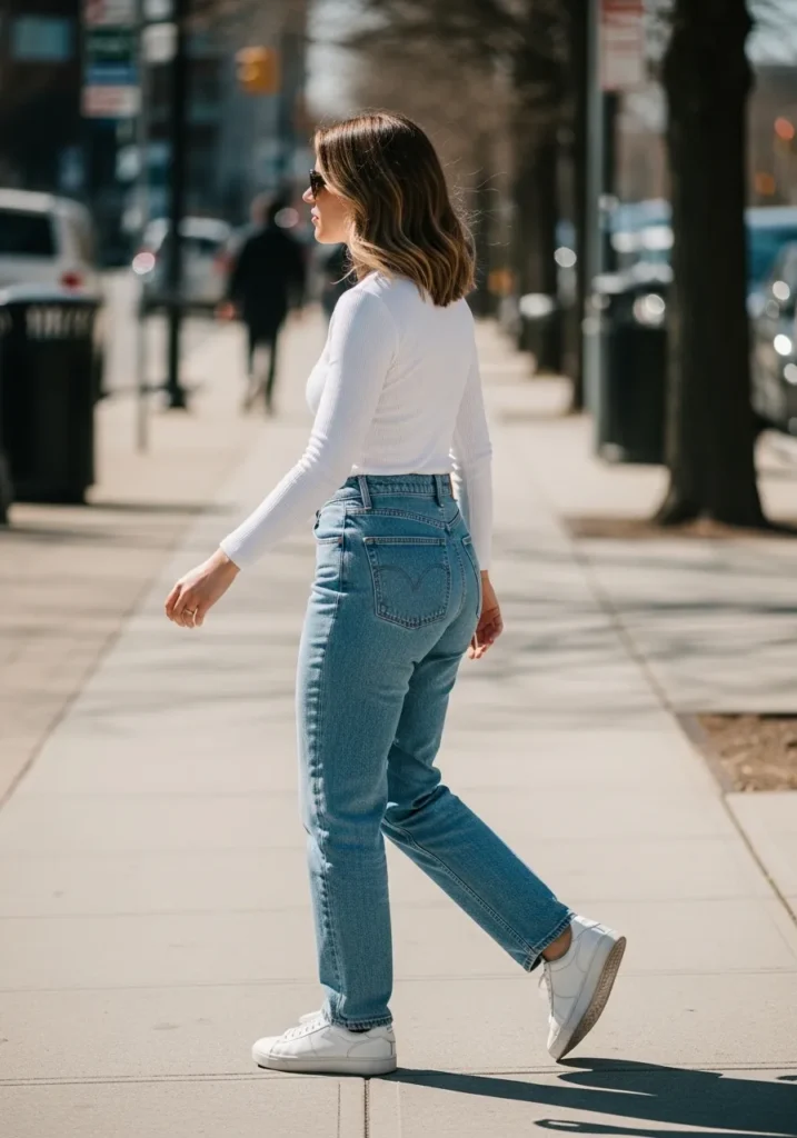 This outfit keeps things simple in the best way with a fitted white long sleeve top tucked into mid wash straight leg jeans. The denim has a clean structured feel while still looking relaxed enough for everyday wear. Paired with crisp white sneakers and minimal accessories, the whole look feels fresh, effortless, and very spring ready.