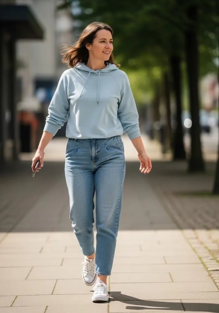 This outfit pairs a soft light blue hoodie with relaxed light wash jeans for an easy everyday spring look. The hoodie feels cozy without being heavy and the jeans keep things casual and clean. White sneakers finish the outfit with a sporty touch that feels practical and fresh.