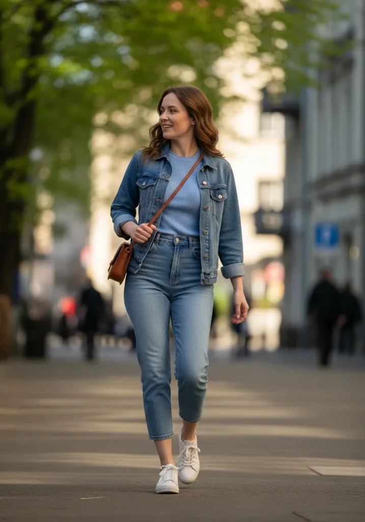 This outfit combines a fitted knit top with a classic denim jacket and cropped blue jeans. The layers add depth while keeping the look light and spring ready. White sneakers and a small crossbody bag make it practical and easy to move in.