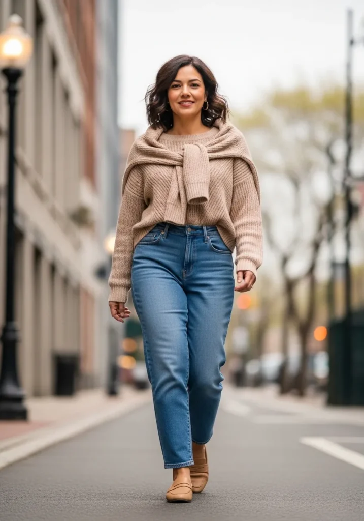 Here we have a soft neutral knit sweater paired with classic high waisted blue jeans for a cozy yet polished vibe. The sweater drapes nicely without feeling bulky and the jeans give just enough structure to balance the softness on top. Finished with simple flats, this outfit feels warm, calm, and easygoing.