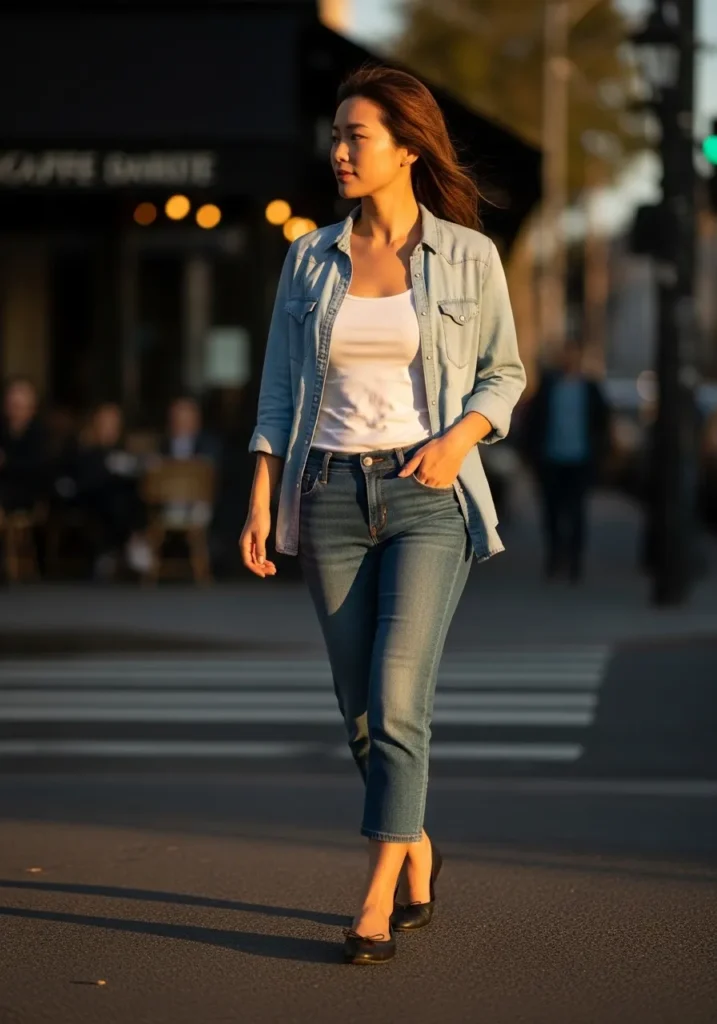 This look features a light denim button down worn open over a white tank top with fitted blue jeans. The layers add depth while keeping the overall outfit light and breathable for spring. Simple black flats keep the look grounded and practical.
