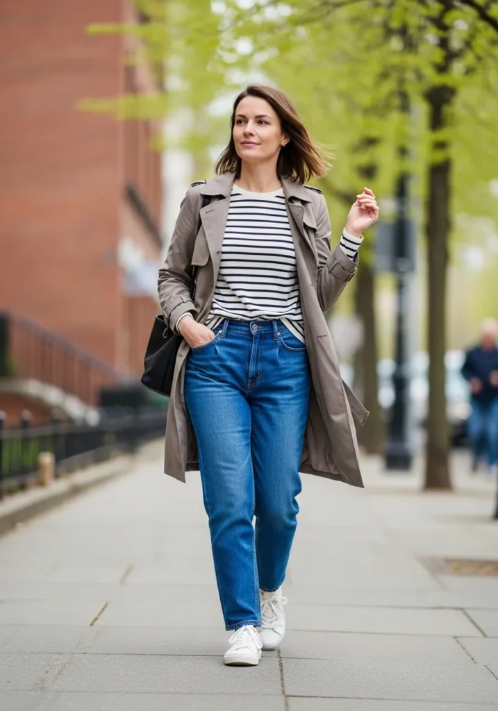 This outfit combines a striped top with classic blue jeans and a lightweight trench coat for a timeless spring look. The stripes add visual interest while the trench gives a slightly elevated feel without trying too hard. White sneakers keep everything casual and walkable.