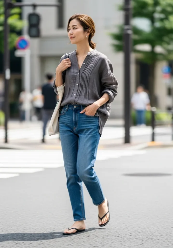 This look features a lightweight button front blouse tucked into classic blue jeans for a simple but polished feel. The blouse has a relaxed shape that keeps it breathable while the jeans add structure and balance. Neutral flats keep the outfit grounded and easy to wear.