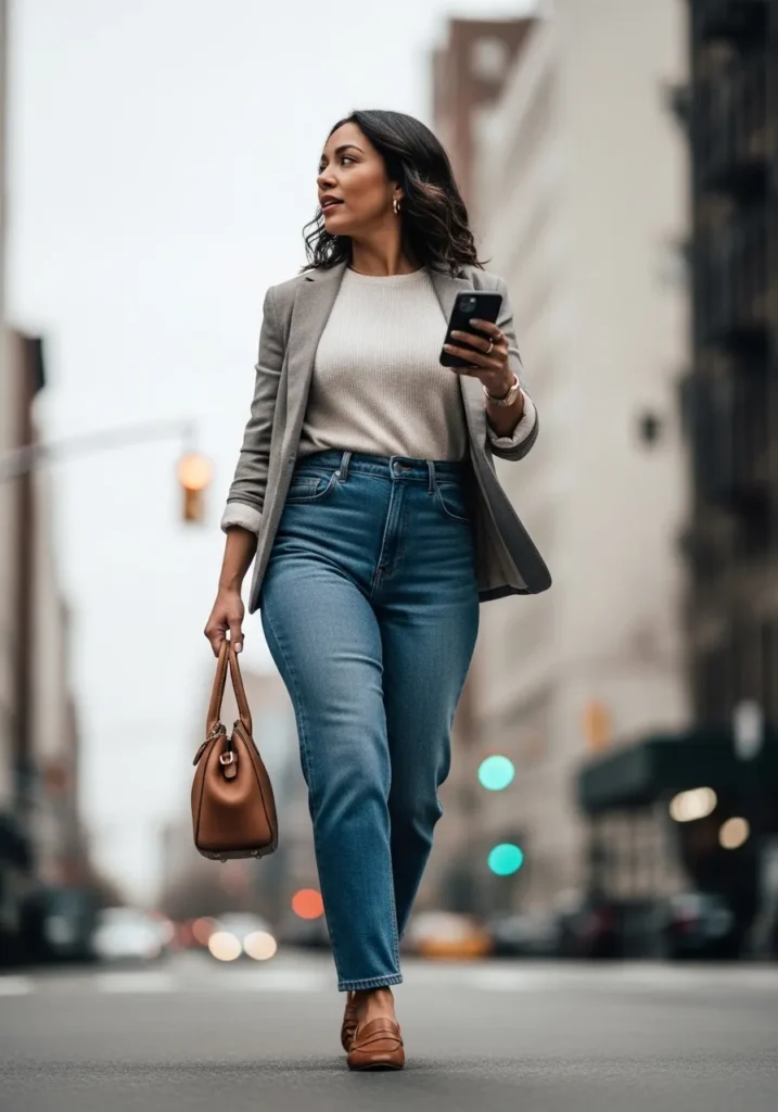I really like how this look feels confident without being overdressed. The blazer makes jeans feel instantly more polished. This is a great option when I want to look put together for meetings or city days while still staying comfortable.
