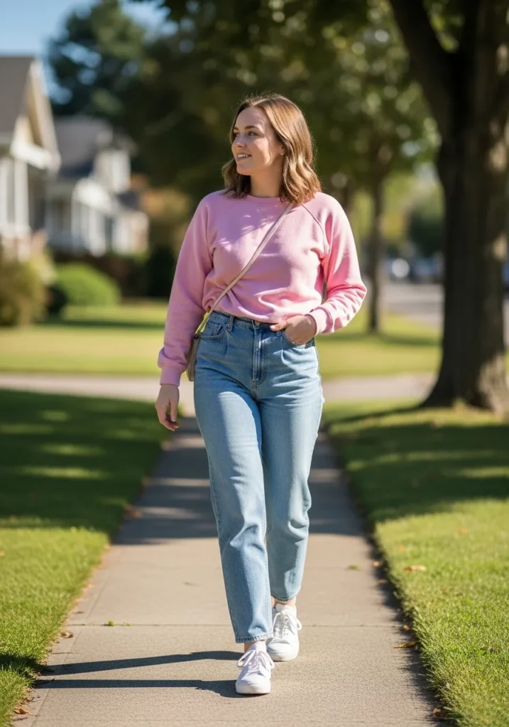 This look features a soft pink sweatshirt paired with light wash jeans and white sneakers. The color feels playful and fresh while the jeans keep everything grounded and casual. A crossbody bag adds an easy everyday detail.