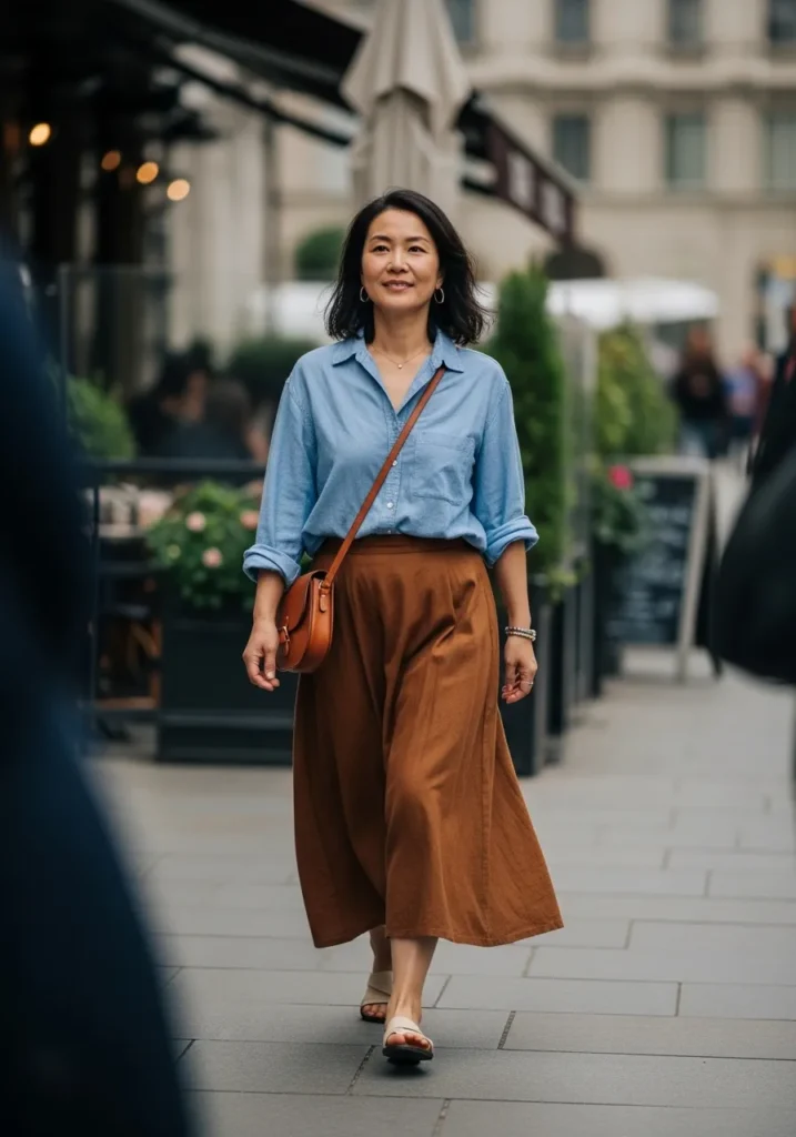 This outfit pairs a light blue chambray shirt with a warm brown midi skirt that moves beautifully while walking. The mix of soft denim fabric and a flowy skirt creates a relaxed but elegant feel that works perfectly for spring. Simple flats and a crossbody bag keep the look grounded and wearable.