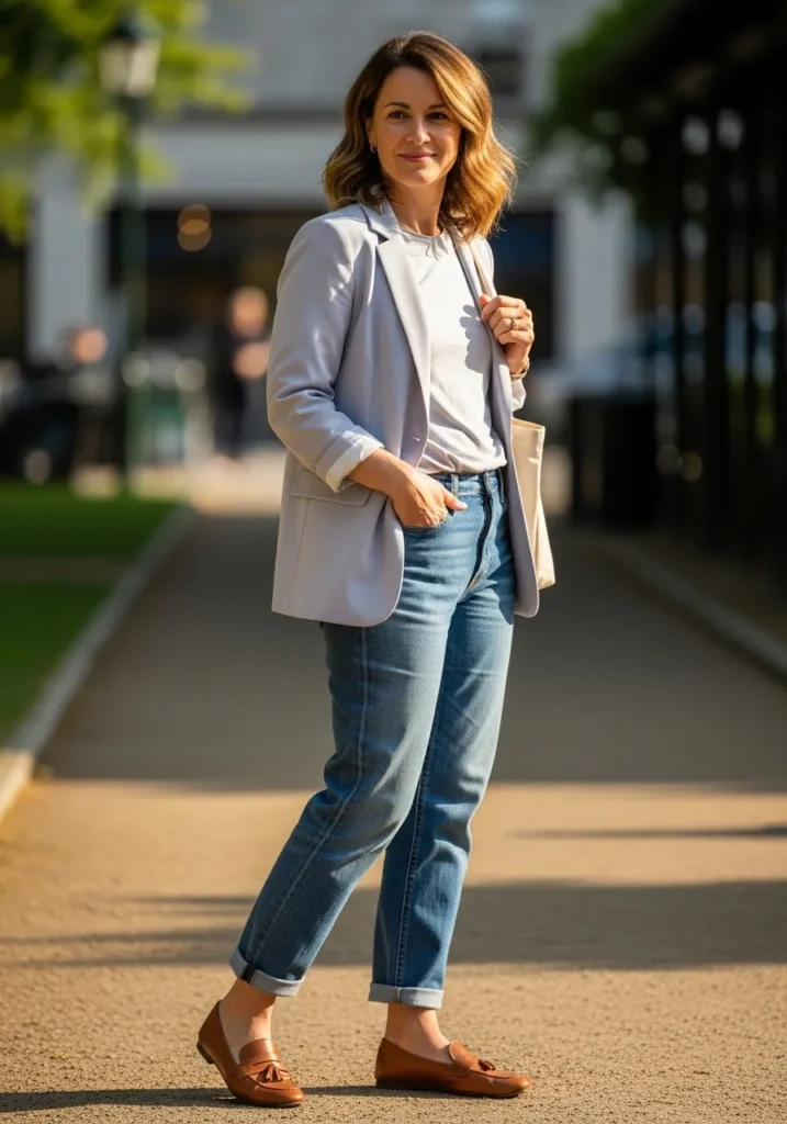 This outfit features a light blazer layered over a simple top, paired with classic blue jeans and flats. The blazer adds polish while the jeans keep everything relaxed and modern. The overall look feels fresh, confident, and perfect for spring days that call for a little extra style.