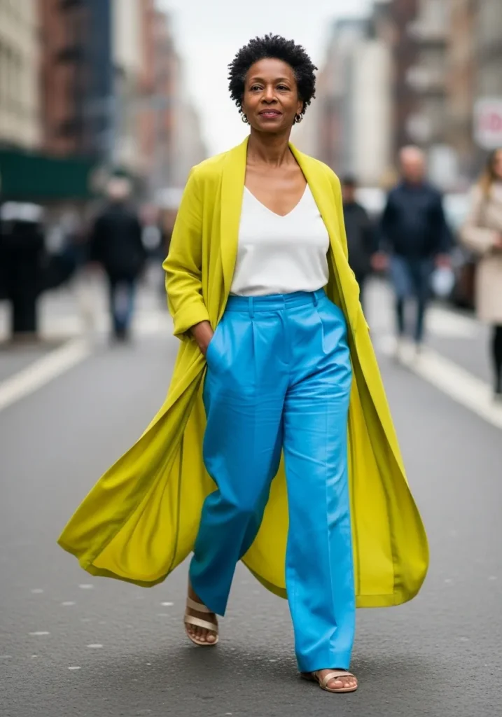 This outfit stands out with a bright lightweight layer worn over a neutral top and wide leg pants in a bold blue tone. The flowy silhouette adds movement while the pop of color keeps things fun and youthful. Simple shoes and minimal accessories let the colors shine.