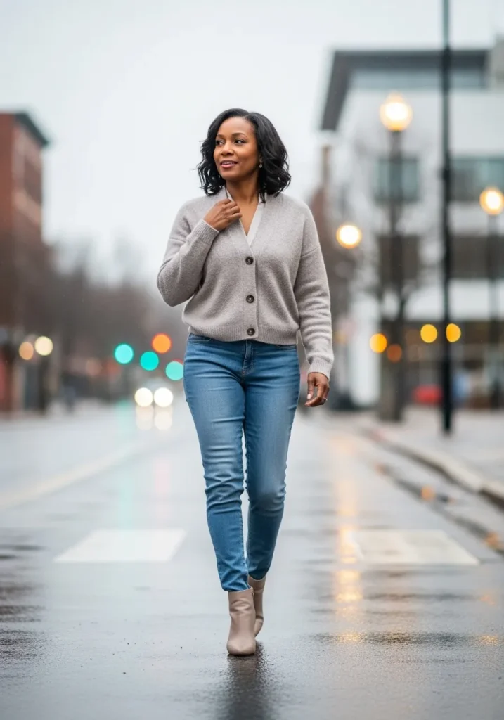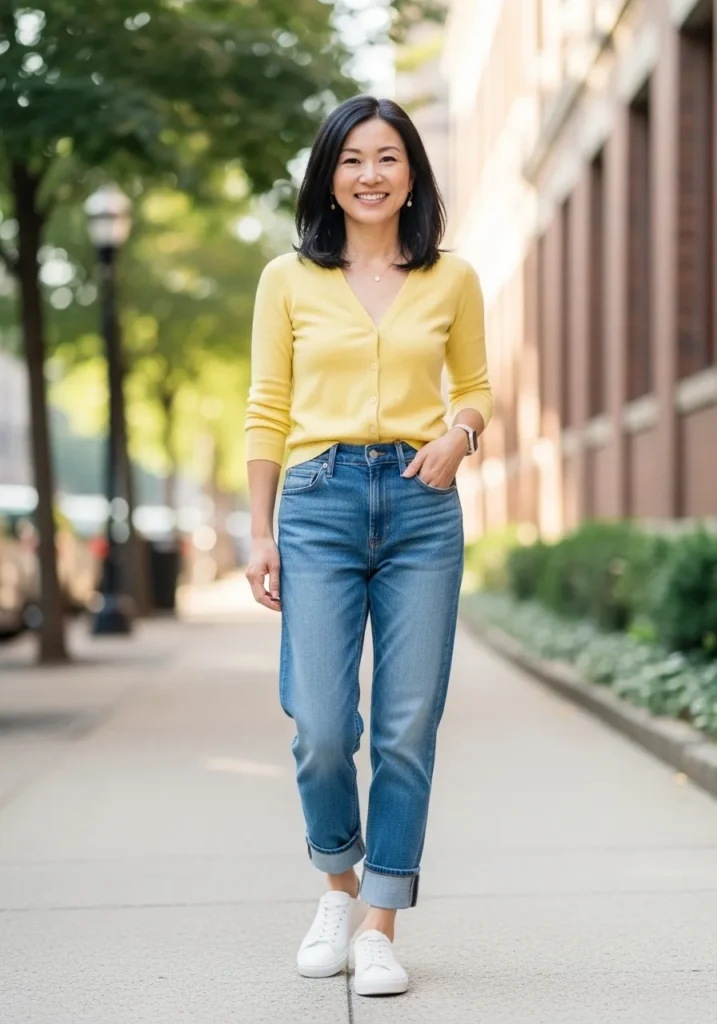 This look pairs a soft yellow cardigan with a simple white top and straight leg jeans. The cardigan adds warmth and brightness while keeping the outfit light and fresh. Sneakers complete the look, making it perfect for everyday spring wear.