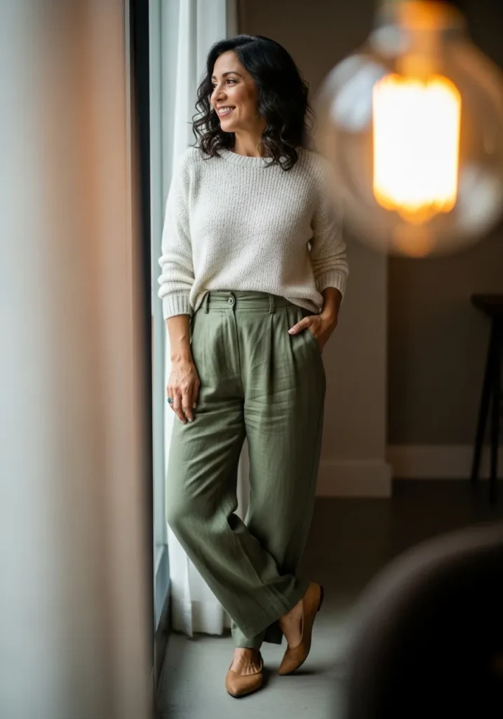 This outfit pairs a soft off white knit sweater with loose olive green trousers that drape beautifully without feeling heavy. The fabric looks lightweight and breathable which feels perfect for spring days. Neutral flats keep everything grounded while the overall vibe feels calm, modern, and quietly stylish. It is the kind of look that feels effortless but still very intentional.