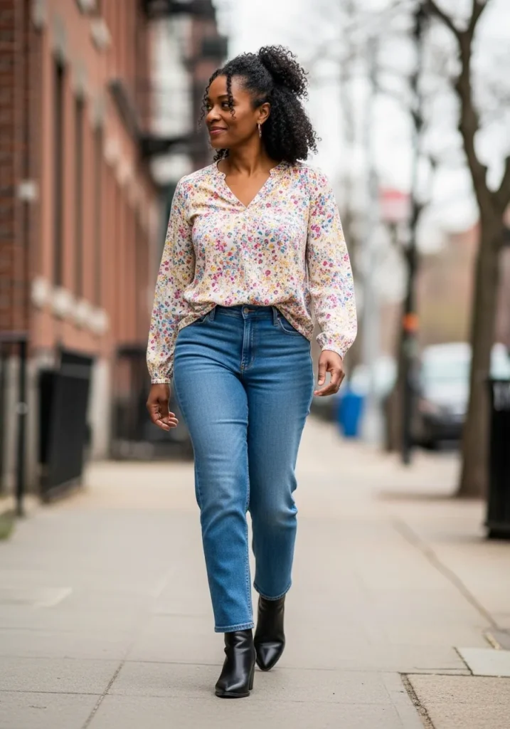 A flowy floral blouse brings color and movement to this outfit, paired with straight leg blue jeans that feel timeless. The soft fabric of the top contrasts nicely with the structured denim. Simple ankle boots finish the look and add a slightly polished edge without overpowering the outfit. The overall vibe feels feminine, easy, and very spring appropriate.