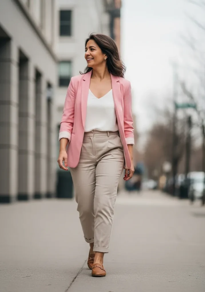 This outfit pairs a soft pink blazer with a simple white top and light beige ankle length trousers for a clean spring look. The fabrics feel lightweight and breathable which is perfect for warmer days. Neutral tones keep everything polished while the blush blazer adds a fresh pop of color that still feels grown and effortless.