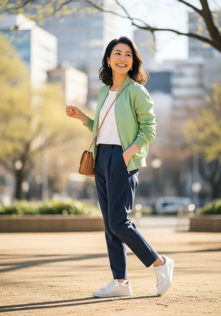 This look combines a crisp white top with dark fitted pants and a light green jacket that adds a fresh spring touch. The fabrics look comfortable and easy to move in, making this outfit feel practical as well as stylish. White sneakers keep the look casual and modern, while a small crossbody bag adds a finishing touch.