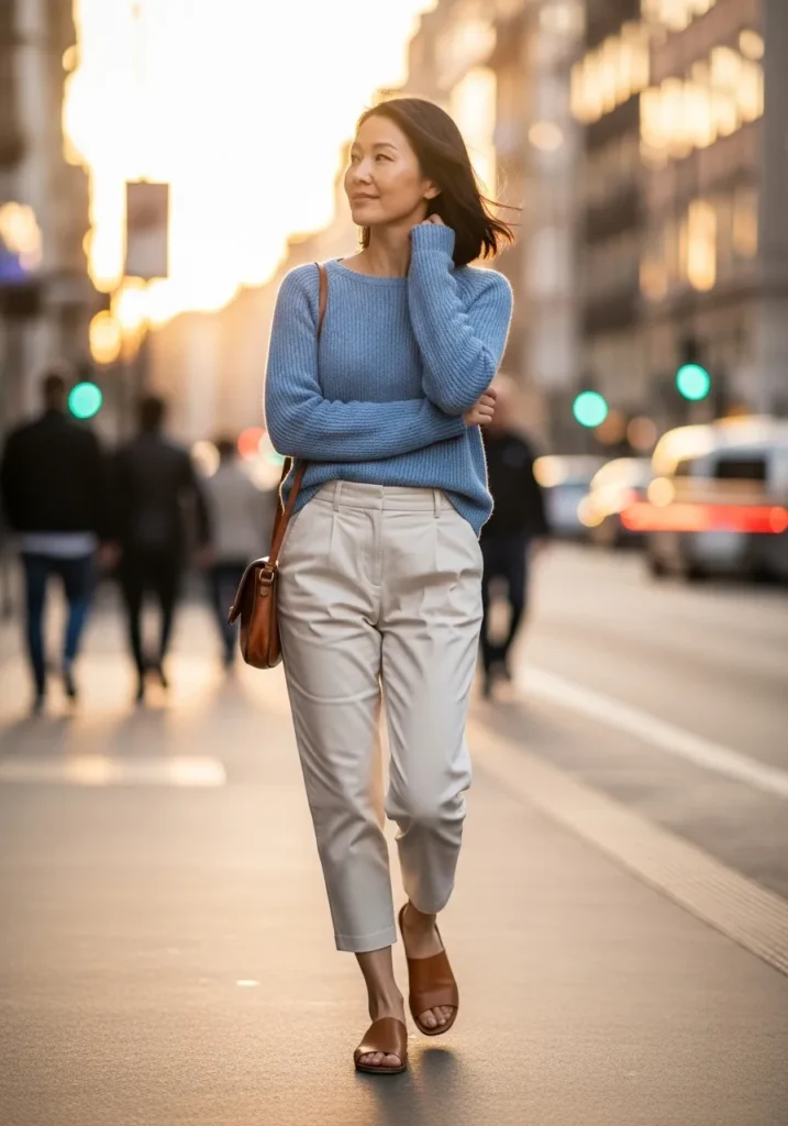 This look features a soft blue knit sweater styled with tailored beige trousers and neutral flats. The sweater has a relaxed fit that feels casual and easy while the structured pants balance everything out. The color palette is calm and timeless which gives the whole outfit an effortless spring vibe.