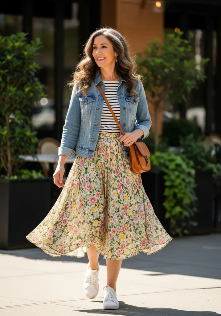 A flowy floral midi skirt steals the show here paired with a striped top and a classic denim jacket. The skirt moves beautifully and adds a romantic spring feel while the jacket keeps the outfit grounded and casual. Soft colors and easy layers make this look perfect for daytime outings.