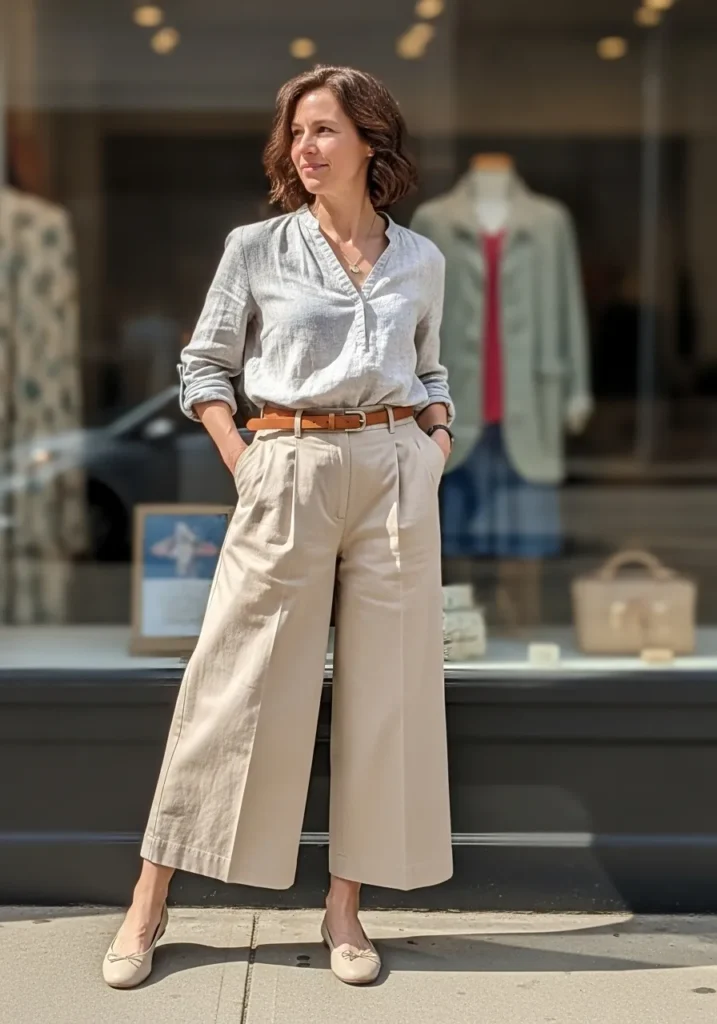 I am drawn to outfits like this because they never fail me. The clean lines and neutral tones make it feel youthful and fresh without any effort. It is comfortable enough for a long day but still looks pulled together which is always a win in my book.