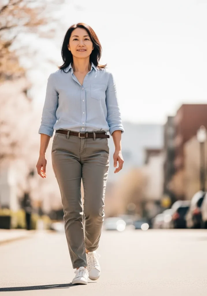 A light blue button down shirt is paired with slim fit neutral pants and casual shoes for a fresh everyday outfit. The colors feel clean and spring ready while the fit stays comfortable and practical. It is a great example of relaxed polish.