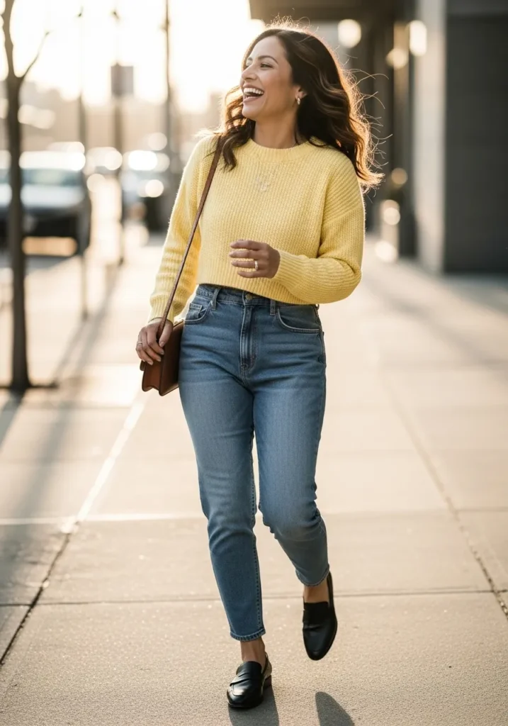 This outfit features a cheerful yellow knit sweater styled with fitted blue jeans and neutral shoes. The pop of color instantly brings warmth and energy while the classic denim keeps it grounded. The overall vibe feels happy and relaxed.