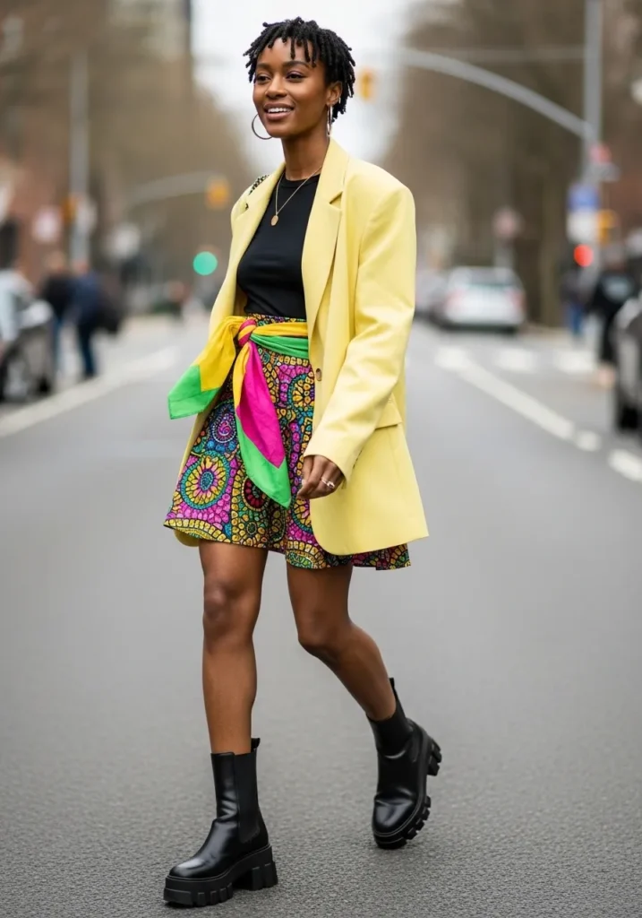 A colorful patterned mini skirt steals the spotlight here and is paired with a black top and a bright tailored blazer. The mix of bold prints and sharp layering gives the outfit serious personality. Ankle boots ground the look and add a bit of edge.