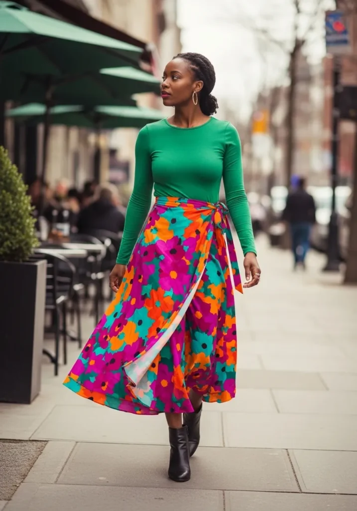 A bold floral midi skirt full of bright colors is paired with a fitted green top that hugs the body nicely. The skirt brings energy and movement while the top keeps the look balanced. Simple shoes let the skirt stay center stage.
