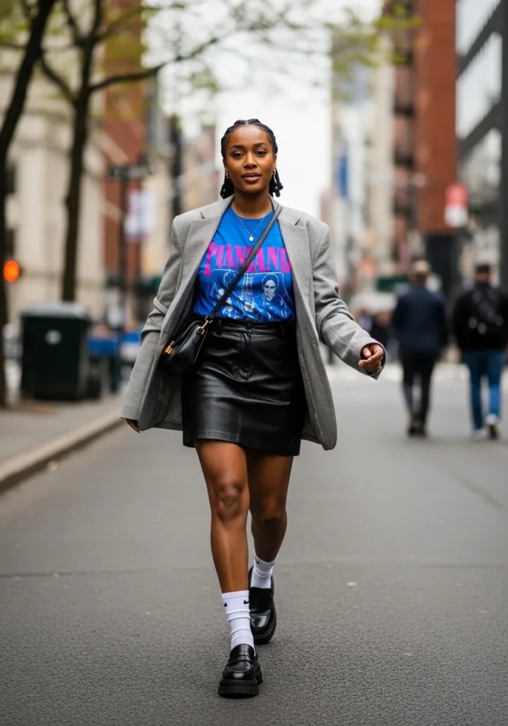 This look mixes a graphic tee with a sleek black mini skirt and a structured blazer for a cool street style vibe. The layering feels modern and playful while the sneakers and socks keep things casual and wearable. It has that effortless city energy that feels confident and bold without being overdone.