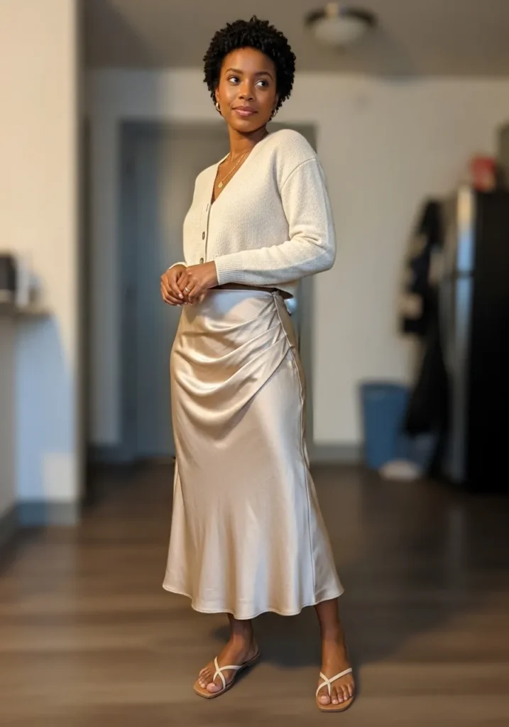 A silky satin midi skirt takes center stage here paired with a lightweight knit top in a soft neutral shade. The smooth fabric catches the light beautifully and gives the whole outfit a gentle elegant flow. Simple heels and clean lines keep the look refined and calm.