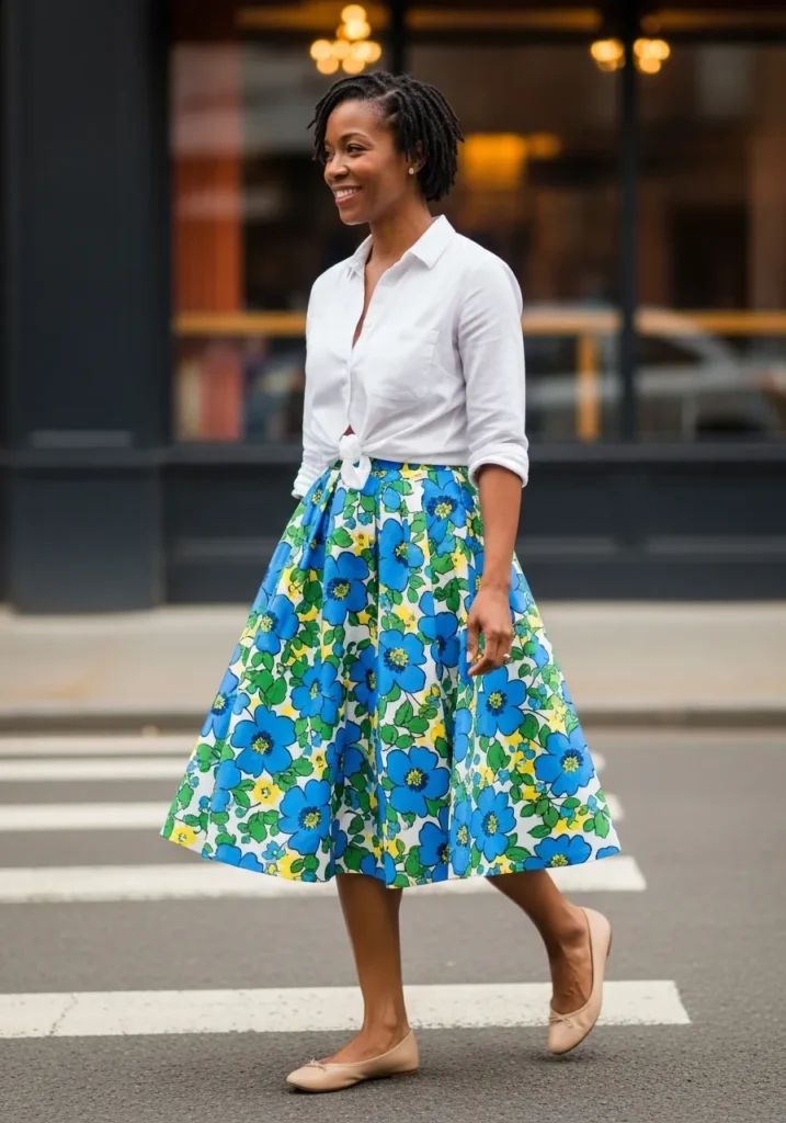 This outfit features a bright floral midi skirt styled with a crisp white button down for a timeless spring look. The structure of the shirt balances the playful skirt while neutral shoes keep everything grounded. It feels classic but still fun and very wearable.