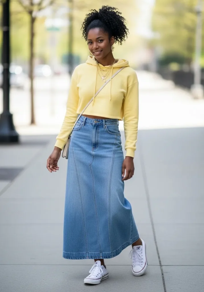 A relaxed denim midi skirt is styled with a soft yellow top for a cheerful spring combo. The denim keeps things casual while the bright color on top adds warmth and personality. Finished with sneakers this look feels easy and perfect for everyday wear.