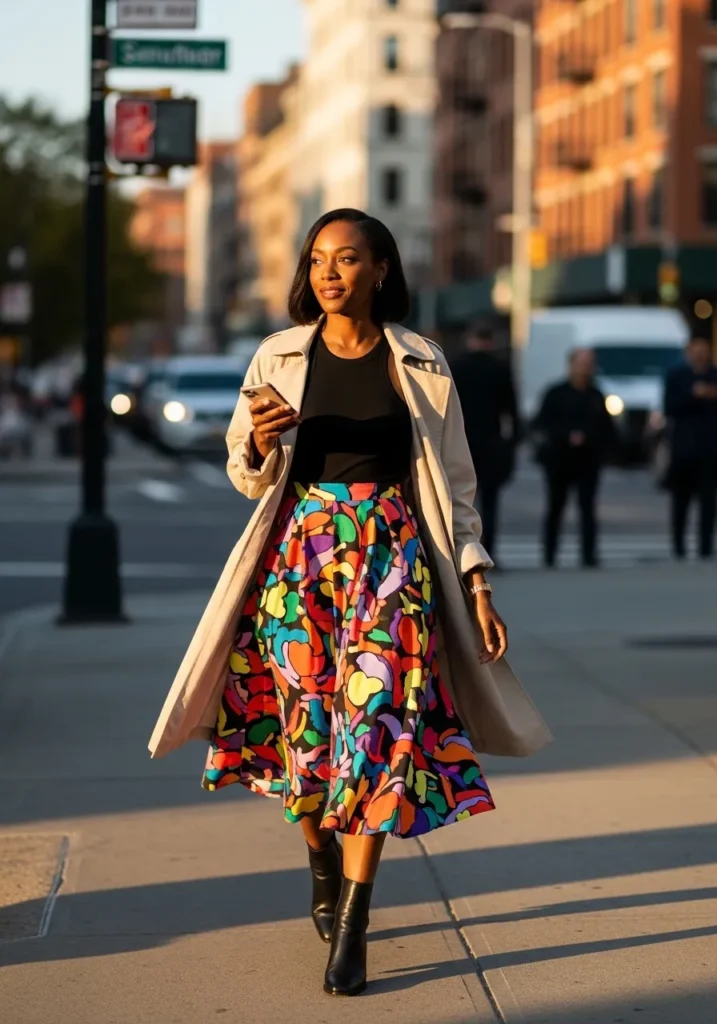 This look centers around a vibrant patterned midi skirt paired with a smple black top and a light neutral coat. The coat adds structure while letting the skirt shine as the statement piece. Everything flows nicely and feels balanced for spring weather.