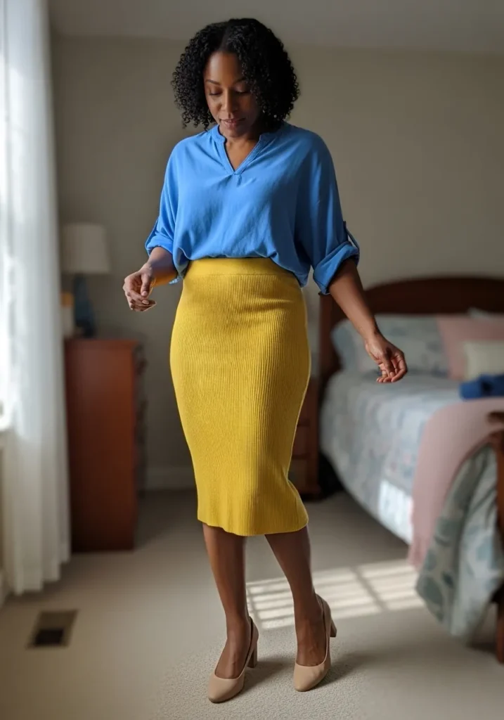 A fitted pencil skirt in a rich yellow shade is paired with a loose blue blouse for a striking color contrast. The skirt hugs nicely while the top keeps the look relaxed and breathable. Simple heels finish it off in a clean and flattering way.
