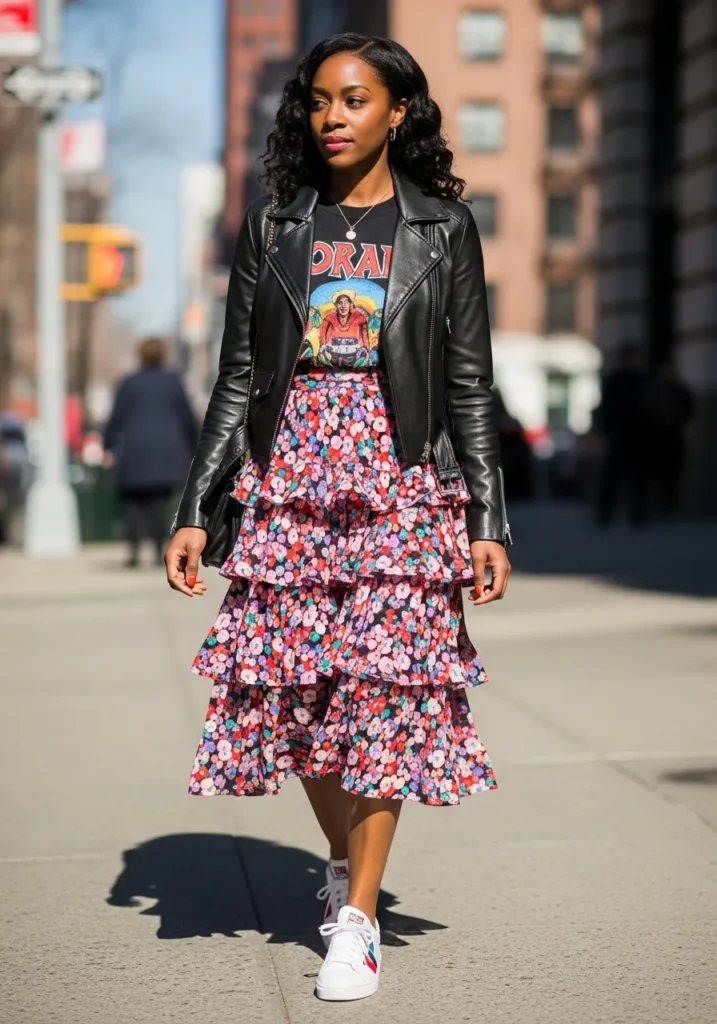 A layered floral midi skirt is styled with a graphic tee and a leather jacket for a cool mix of feminine and edgy. The ruffles add movement while the jacket grounds the look with a bit of attitude. It feels modern playful and very wearable.