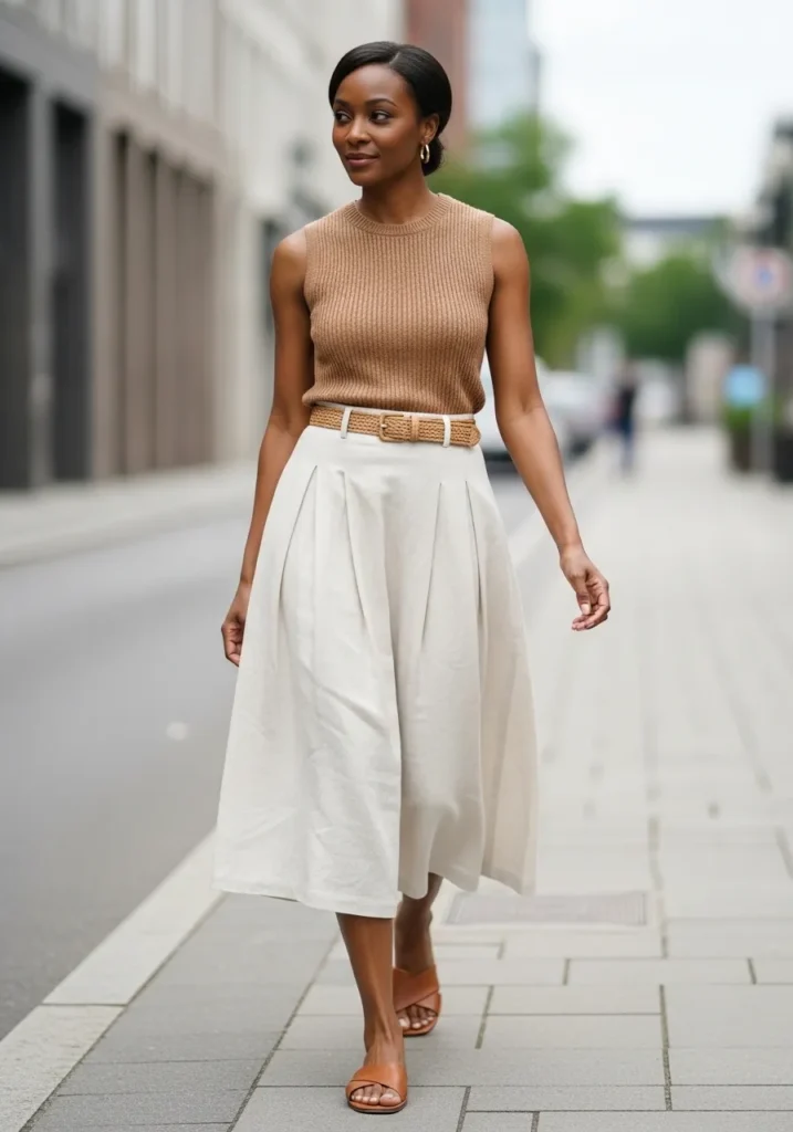 This outfit features a soft neutral midi skirt with beautiful movement paired with a fitted sleeveless top in a warm earthy tone. The fabric looks light and breathable which feels perfect for spring walks around the city. Simple sandals and minimal accessories keep the look clean and polished without trying too hard.