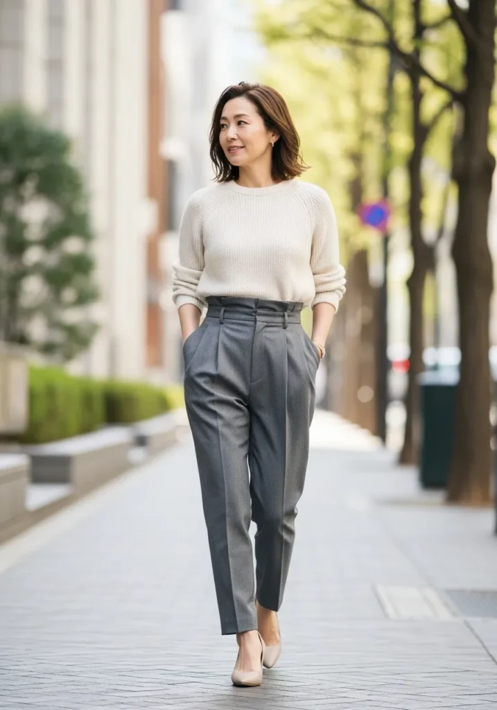 This outfit pairs a lightweight cream knit top with high waisted gray trousers that have a relaxed but structured fit. The soft knit contrasts nicely with the crisp trousers and the overall palette feels light and effortless. Simple flats and understated styling keep it work appropriate and timeless.