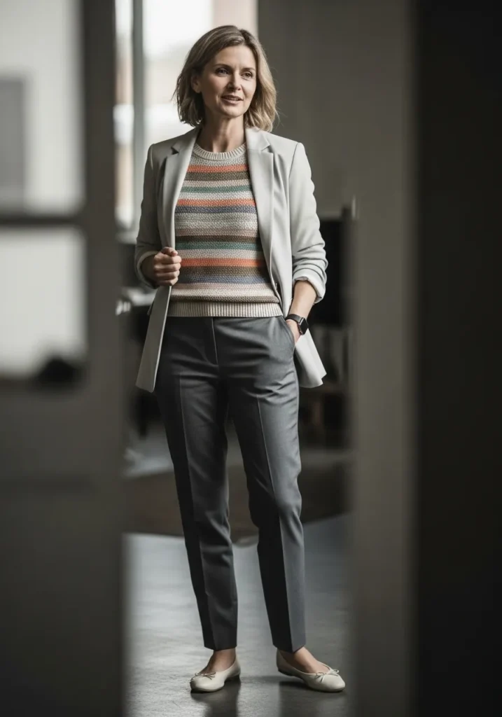 Here we see a classic gray blazer layered over a striped top and paired with slim dark trousers. The stripes add visual interest while the blazer keeps everything grounded and office ready. Neutral shoes and minimal accessories make the whole look feel cohesive and smart.