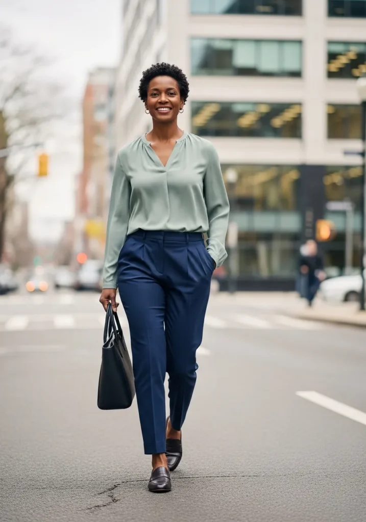 This outfit combines a soft light blouse with tailored navy trousers for a clean and modern work look. The blouse feels airy and feminine while the trousers add structure and authority. A classic work bag and simple shoes finish it off beautifully.