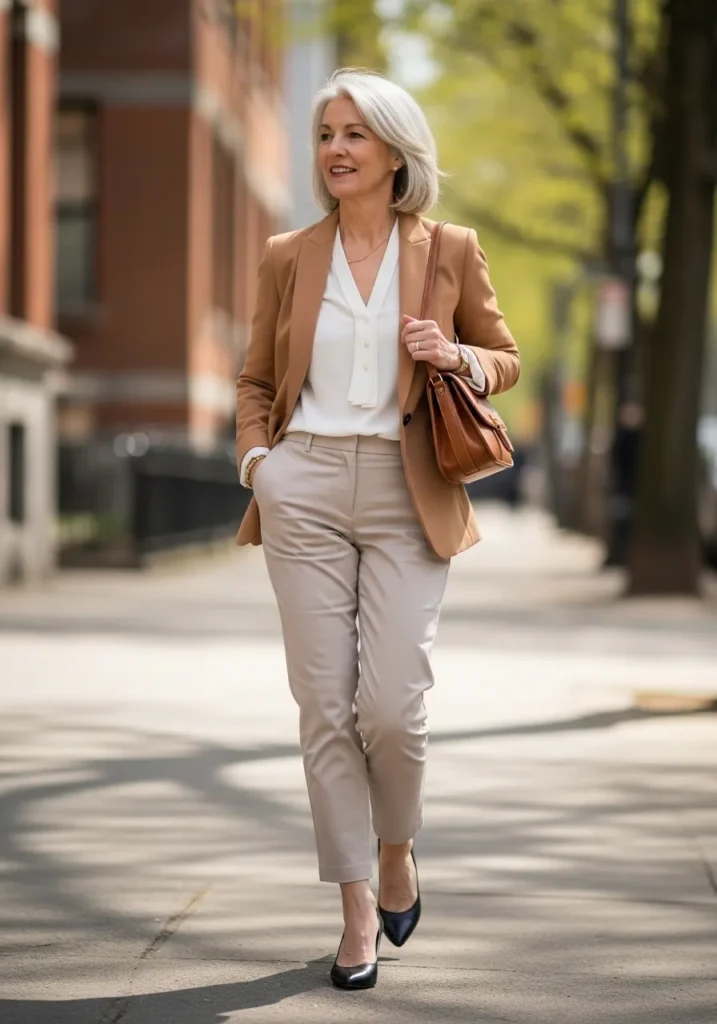 A warm toned blazer is layered over a white blouse and paired with light neutral trousers. The mix of soft beige and warm brown tones feels very spring friendly and elegant. The overall fit is tailored but not stiff which keeps the outfit wearable and chic.