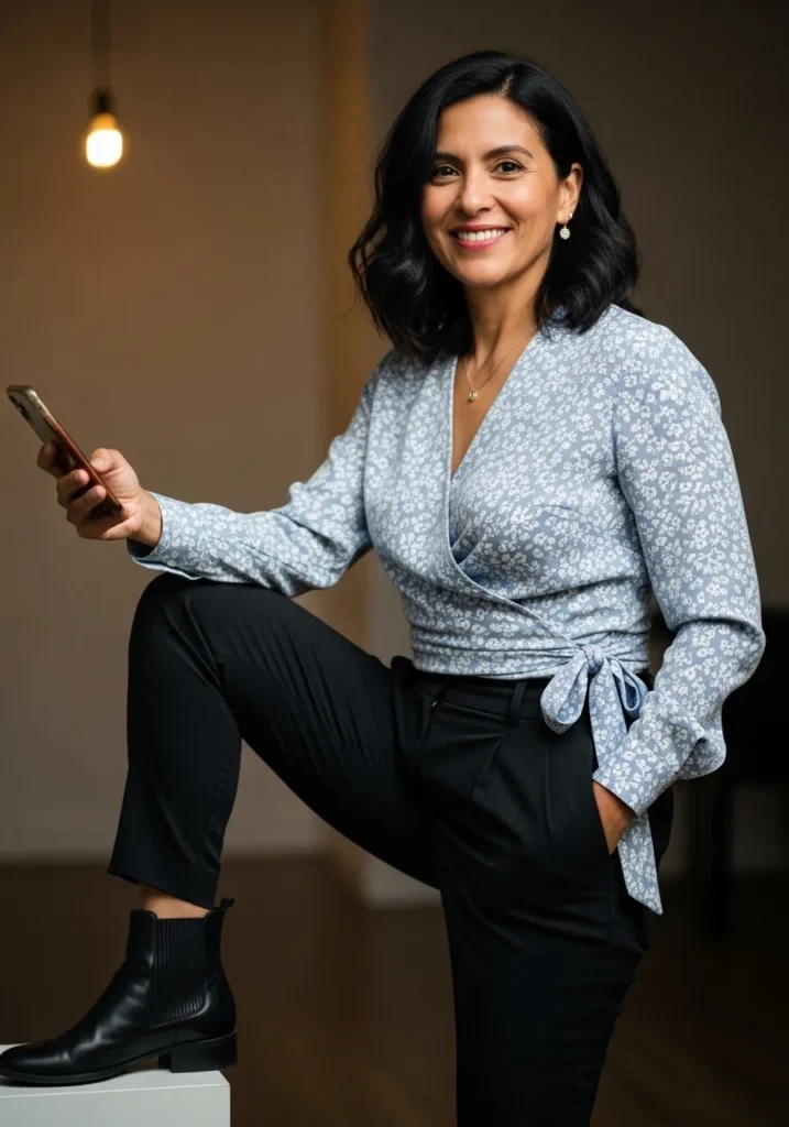 This look features a wrap style patterned top paired with slim black trousers. The wrap detail adds shape and interest while the dark pants ground the outfit and keep it professional. Simple shoes and clean styling let the top stand out.