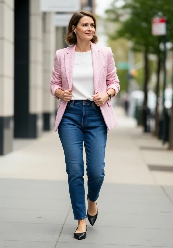 This outfit mixes a soft pink blazer with a white top and classic blue jeans styled in a very clean tailored way. The blazer instantly elevates the denim and makes the look office friendly while still feeling relaxed and modern.