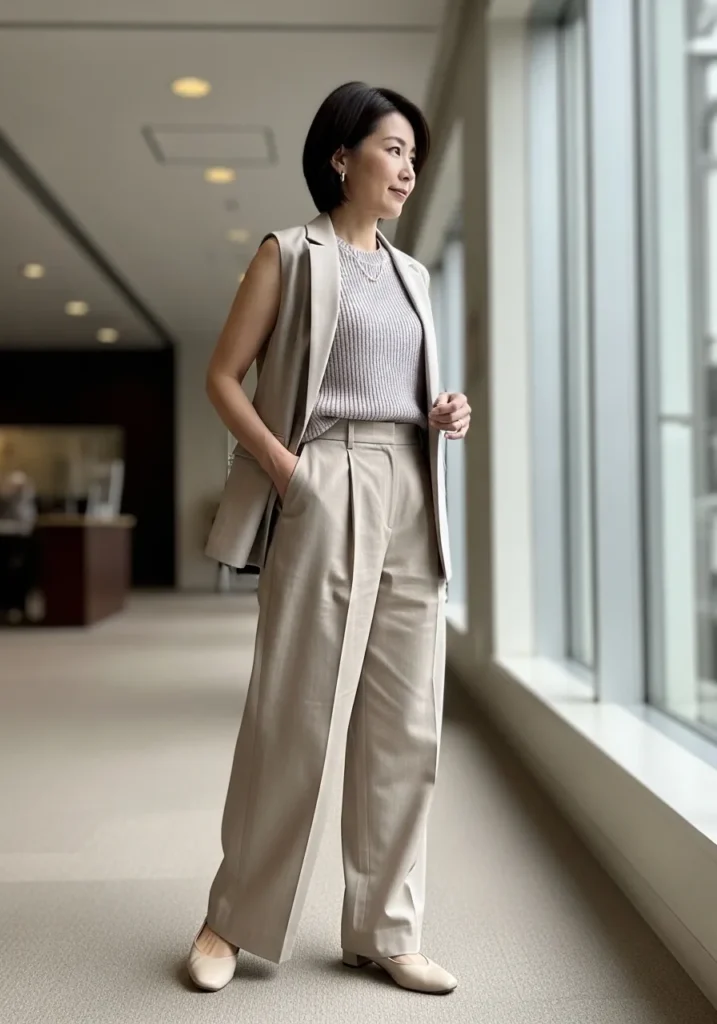 This look is all about clean lines with a sleeveless neutral top tucked into wide leg beige trousers. The fabrics look light and flowy which feels perfect for spring. Simple shoes and minimal accessories keep the focus on the elegant silhouette.