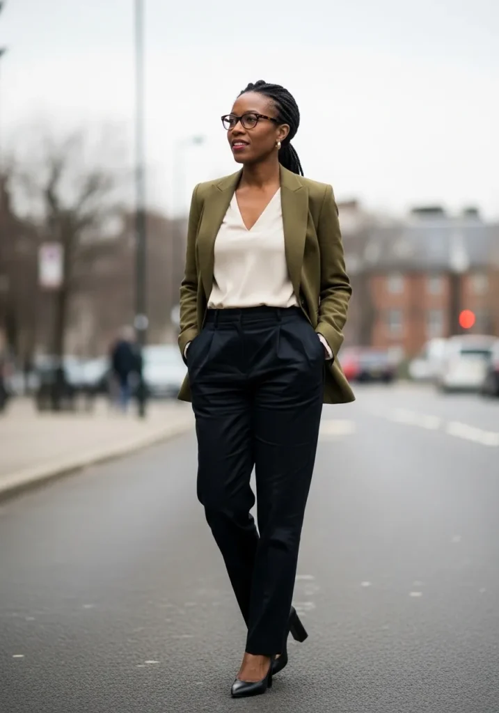 This look features an olive green blazer layered over a light neutral blouse and paired with relaxed black trousers. The blazer adds structure while the softer tones underneath keep it approachable and modern. Clean lines and simple shoes make the outfit feel intentional and professional.